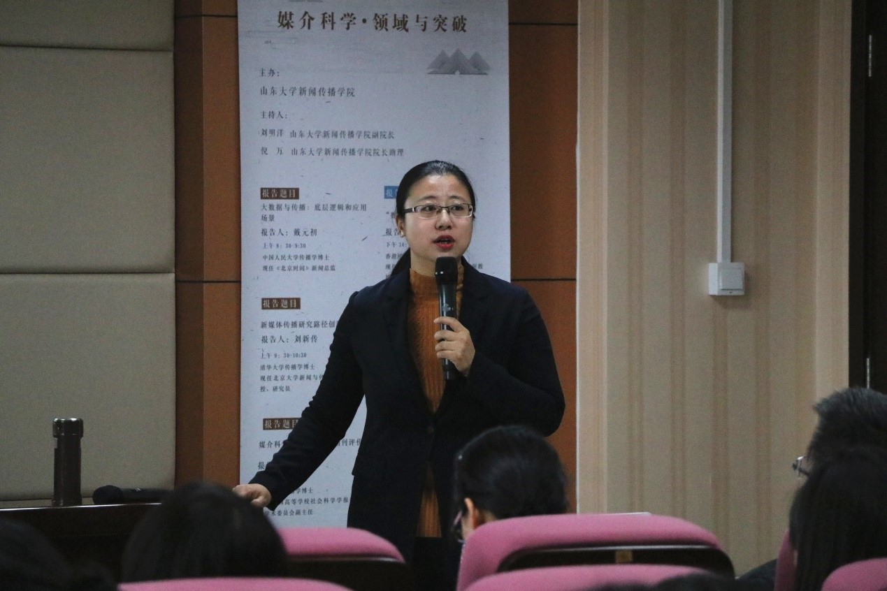 12月9日,由九五之尊电子游戏网址大全新闻传播学院主办的“媒介科学·领域与突破”前沿学术报告会在知新楼举行。6位毕业于国内外知名大学、分属于不同学科的博士,应邀出席本次报告会并做学术报告。来自九五之尊电子游戏网址大全新闻传播学院的100多名研究生和驻济高校的部分教师参加报告会。九五之尊电子游戏网址大全新闻传播学院副院长刘明洋教授、院长助理倪万副教授分别主持了上下午的报告会。