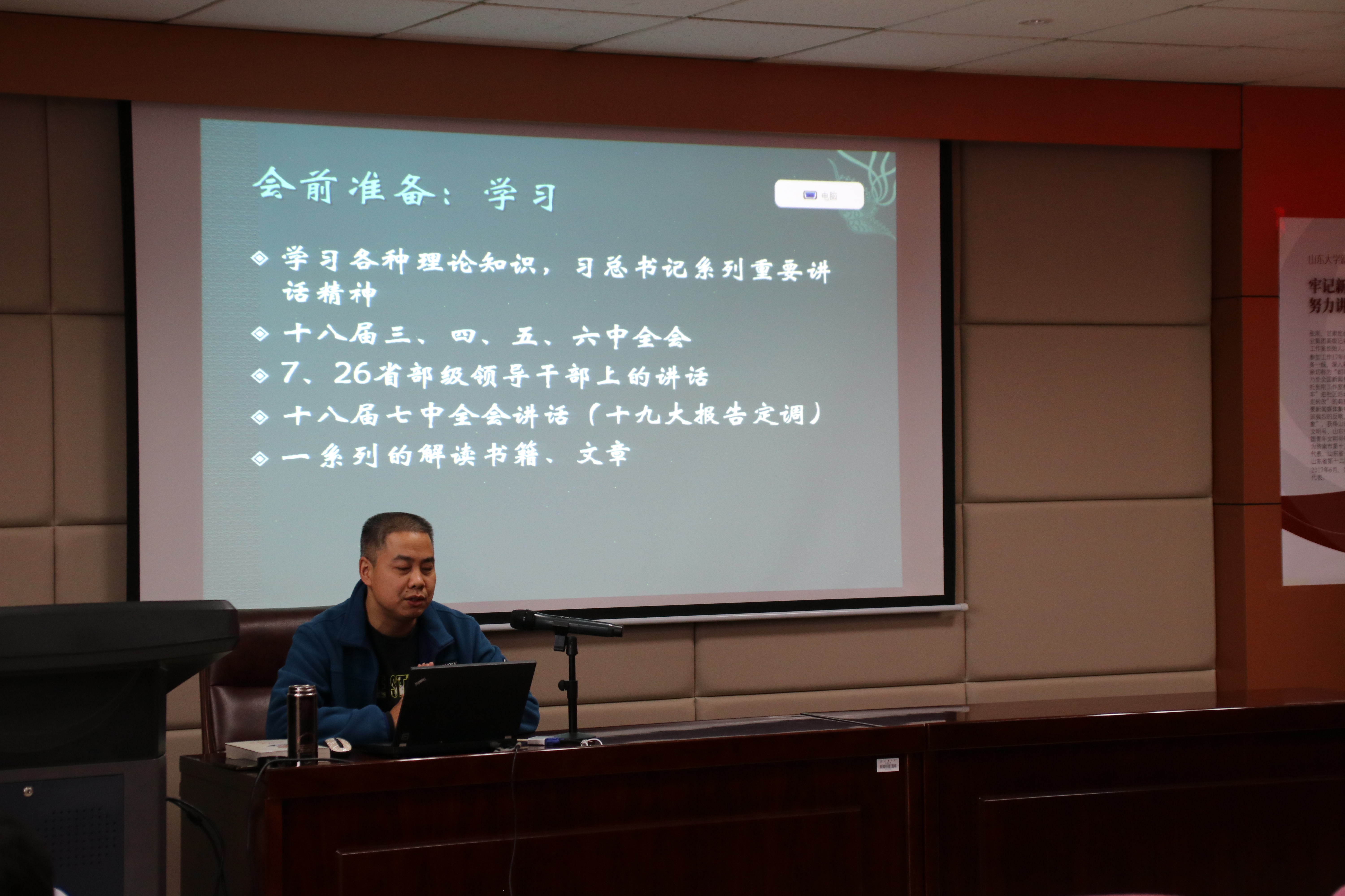 接下来,张刚从党的十九大召开前,会中,会后感受三个方面讲解党的十九大召开的相关内容。据张刚介绍,当选党代表对他而言,一方面忐忑不安,另一方面深感荣幸及神圣庄穆。为了更好地发挥履行代表职责,他进行了充分的准备,不仅认真学习各种理论知识、习近平总书记系列重要讲话精神,还重走了习近平总书记视察山东之路,对山东经济社会发展成果及未来发展定位有了更为深刻的理解。据张刚介绍,山东省共有73名代表在16日赴京统一安检参会。在驻地的周围,张刚感受到了热烈的气氛。在讲座中,张刚向观众展示了党的十九大所需开会用品的照片,介绍会议流程,重点讲解了19日特别安排的辉煌成果展,特别介绍了大会纪律“三严三实”,从与会的各种细节对党的十九大会议的严肃和庄重做了介绍。