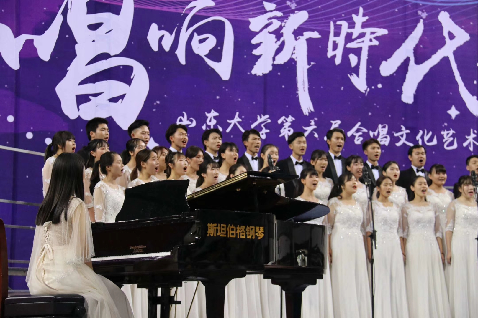 此次合唱比赛中,新传“随新唱响”合唱团展现青春靓丽。女生一席白裙,男生西装革履,用他们悠扬的歌声在舞台绽放光彩。