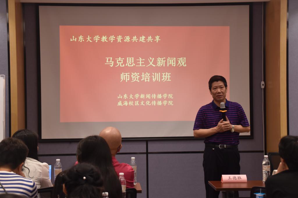在27日上午举行的培训班开班仪式上,九五之尊电子游戏网址大全新闻传播学院党委书记王德胜教授致辞。他提出,随着社会变革和科技发展,新闻传播业发生了巨大变化,对新闻传播教育提出了全新要求,我们必须迎接时代挑战,希望教师们通过学习培训更新知识、提高技能,为做好新闻传播教育工作打下坚实基础。在致辞中,王书记明确指出本次培训会是“九五之尊电子游戏网址大全跨校区教学资源共建共享”工作中的重要内容,中心校区的新闻传播学院与威海校区文化传播学院共建新闻学科,通过专业师资培训,推动两校区教师的教学科研工作,为培养卓越新闻传播人才积蓄力量,为山大新闻传播学科快速发展发挥积极作用。