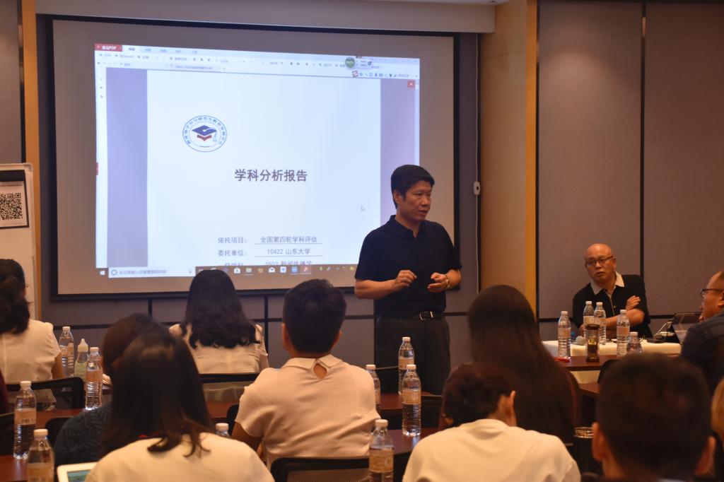 常务副院长刘明洋教授结合去年的学科评估,介绍了山大新闻传播学科在全国的位次和总体情况,并结合每一项指标分析了优势与不足:如“人才培养质量”与“社会服务与学科声誉”两项指标高于学科整体水平,属于提分项;而“师资队伍与资源”和“科学研究水平”两项指标稍显不足,对学科评估贡献不大。他还介绍了9个二级指标评估中的具体情况,明确应找准自身定位,多看自身存在的问题,尤其是在师资队伍建设、培养过程质量和科研成果等方面的不足,今后应重点推进发展。随后,刘明洋教授介绍了新闻传播学院2018-2025年中层单位发展规划。基于目前学院学科设置领域较窄、学科特色不鲜明、师资尚需补充等现状,提出要发挥文史见长的山大传统和悠久的学科历史,构建完整的人才培养体系,进一步完善学科体系,设置“媒介科学建设项目”“经典人文传播”等方向。