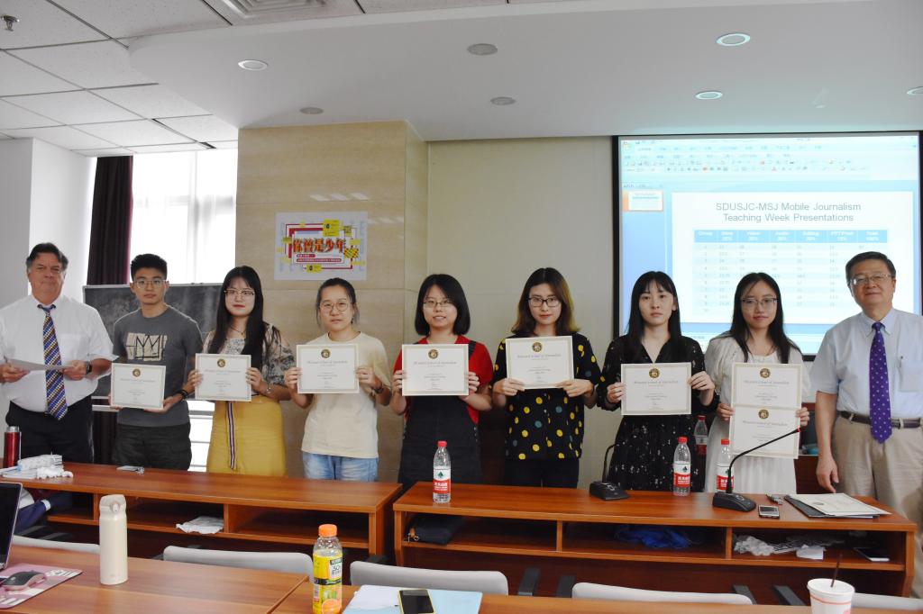 在学校本科生院和国际事务部的大力支持和推动下,7月7日-12日新闻传播学院与世界上第一所新闻学院—密苏里大学新闻学院联合开展了“暑期海外师资课程”项目,为来自中心校区和威海校区的新闻专业学子们带来了立足于科技前沿的“移动工具新闻报道的艺术与技术”的精彩课程。这次课程由密苏里大学新闻学院的史蒂文·赖斯(Steven Donald Rice)教授和章于炎博士担纲,以理论讲授和拍摄及后期制作实践指导的方式,展开了为期一周的系列讲座和点评指导。