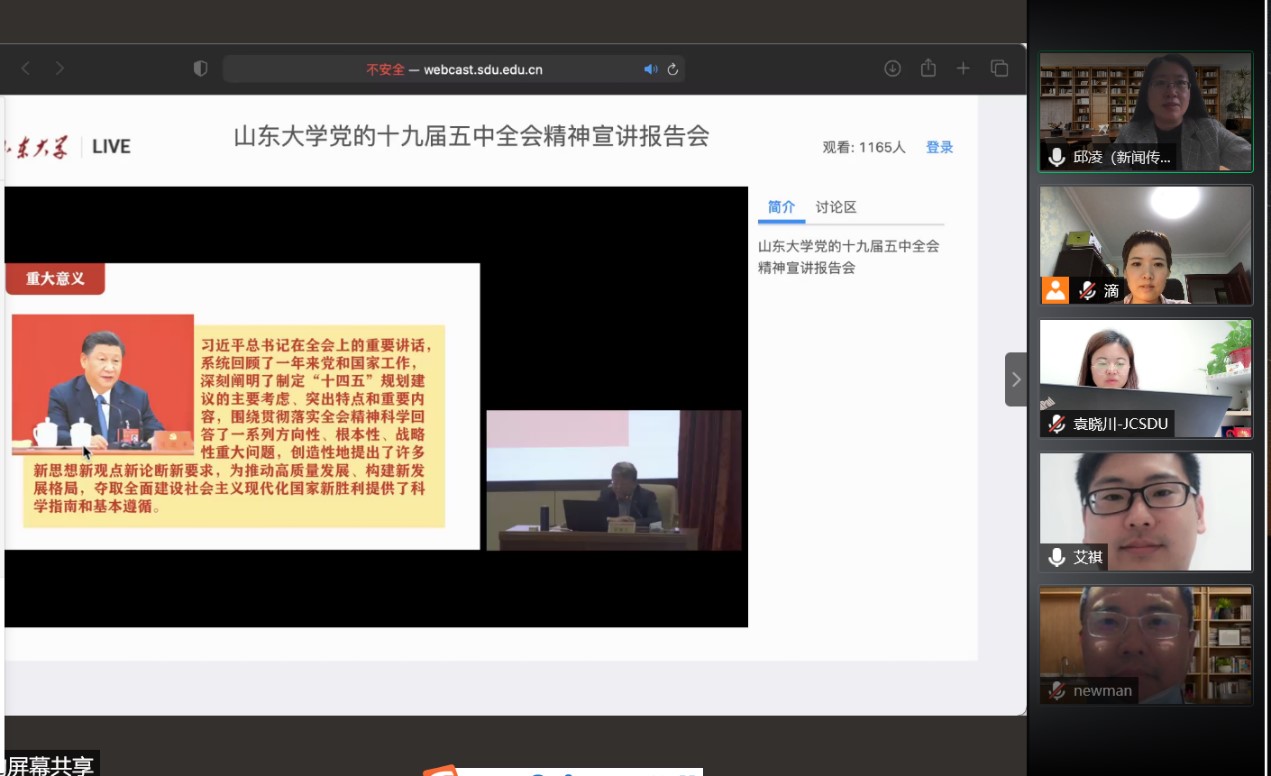 11月26日下午,九五之尊电子游戏网址大全新闻传播学院各师生党支部通过集中收看直播、集体在线观看等多种形式共同学习了校党委书记郭新立关于中共第十九届五中全会的宣讲报告,领会习近平总书记重要讲话与全会精神,结合山大发展现状展望未来。