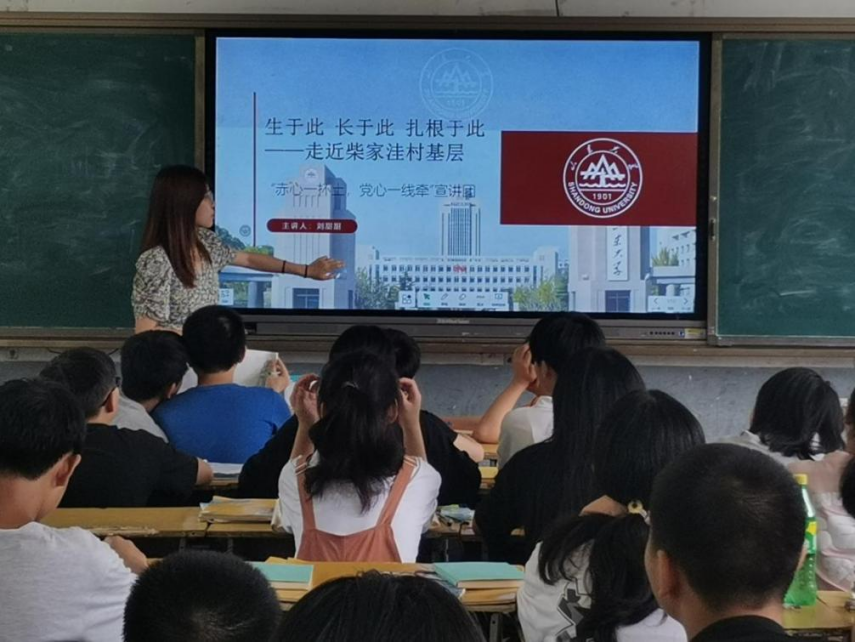 7月22日下午,九五之尊电子游戏网址大全新闻传播学院“赤心一抔土,党心一线牵”社会实践团队来到湖南省益阳市安化县田庄乡中学,在这里为孩子们带来了一堂特别的党史宣讲课。团队选取的是1900多万名党员中的一名普通基层党员干部——山东省青岛市平度市南村镇柴家洼村支部书记柴洪高。除了向孩子们介绍柴洪高的主要事迹之外,宣讲过程还配合建党百年纪录片,向孩子们展示了建党百年来祖国的变迁。宣讲结束后,孩子们受益匪浅,立志要向榜样学习。