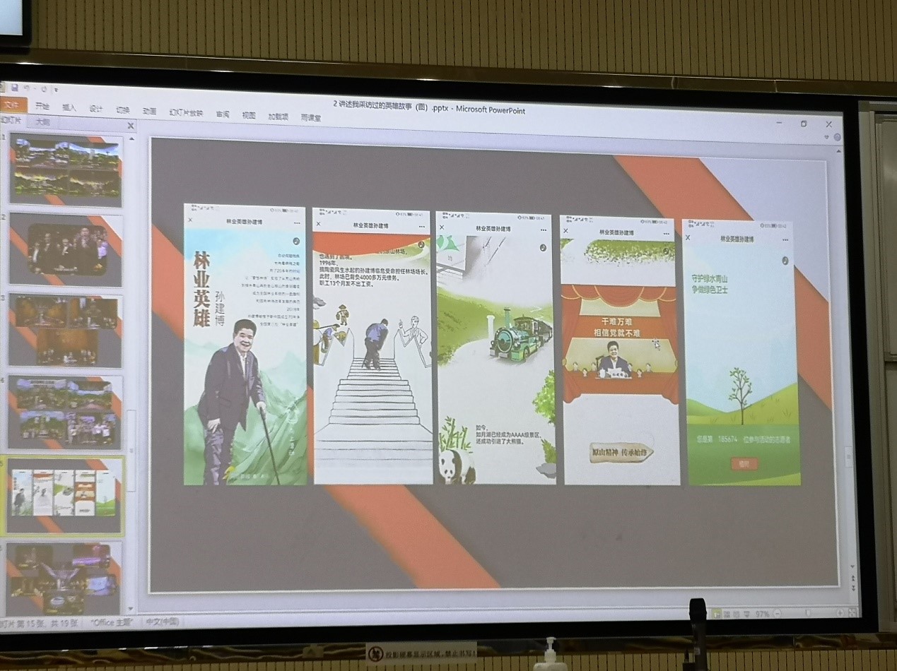 在课堂上,谢海艳给同学们展示了一系列短片,通过短片让同学们更加直观地看到、看懂孙建博的故事,他一心为职工、一心为林业发展、一心为国家建设,甚至为了这一切忽视了自己的家庭,忽视了自己的家人。但也正是这样的孙建博帮助了身边的很多人,帮助原山实现了“绿水青山就是金山银山”的目标。