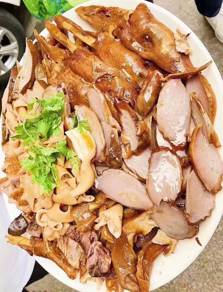 潮品家宴餐厅的特色菜式是正宗潮汕卤鹅、普宁豆干。负责人表示,想要做好正宗的潮汕卤鹅,必须选用潮汕本地特产良种鹅狮头鹅,洗净晾干、用精盐腌制一段时间,将炒过的川椒粒与八角、桂皮等卤料放在纱布中包扎成球,淋上酱油、黄糖,用南姜擦拭并覆盖鹅的表面,同时在鹅的腹中放入南姜去除腥味。在卤制时注意不断翻面,将鹅吊起离汤四次,最后捞起放凉、切成0.7厘米左右的厚片,淋上卤汁并洒上芫荽上桌,蘸蒜泥醋食用。粤菜的制作工序之精细和繁琐可以从潮汕卤鹅中窥见一斑,也侧面印证了粤菜为何能够享誉全球。