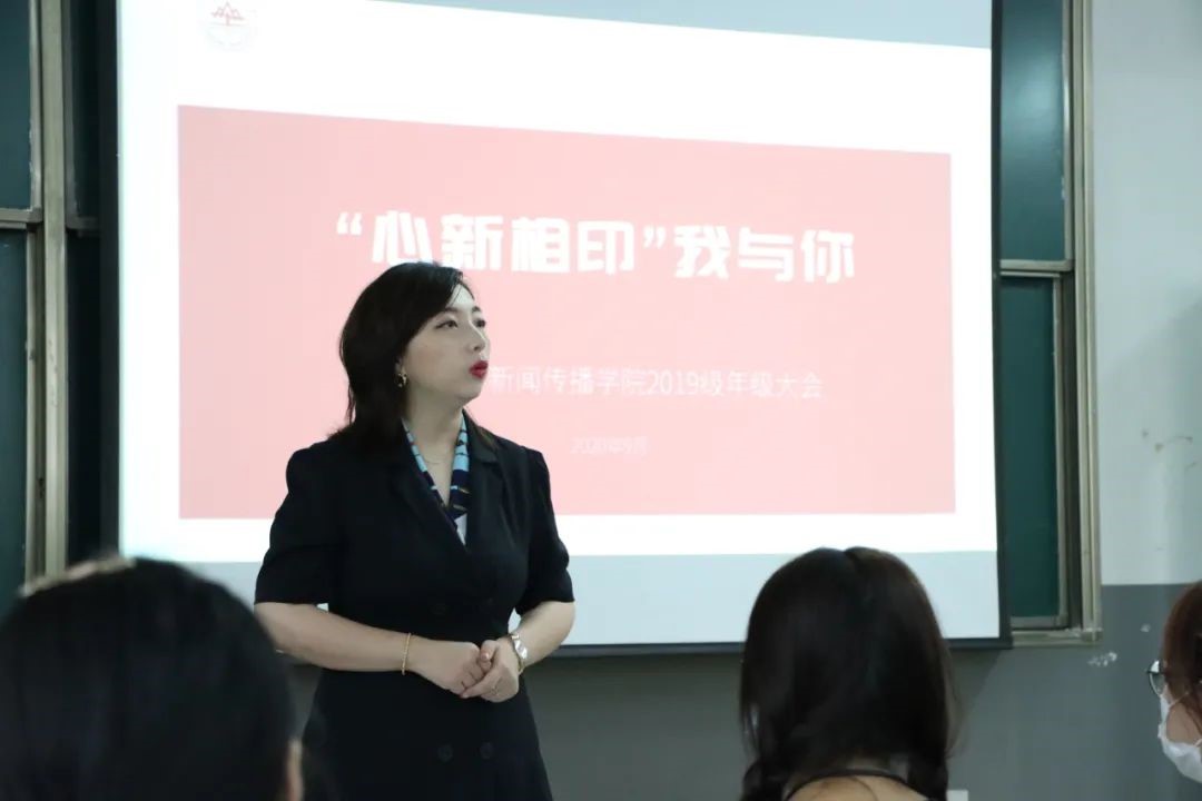9月15日星期二上午8时30分,新闻传播学院2019级本科生在中心校区理综楼215召开主题为“心新相印我与你 尽情书写山大梦”的返校后第一次线下年级大会。新闻传播学院2019级本科生班主任侯滢、辅导员许玉莲、辅导员助理戴永洁、2019级全体本科生参会。会议由2019级一班学习委员刘鲁倩主持。