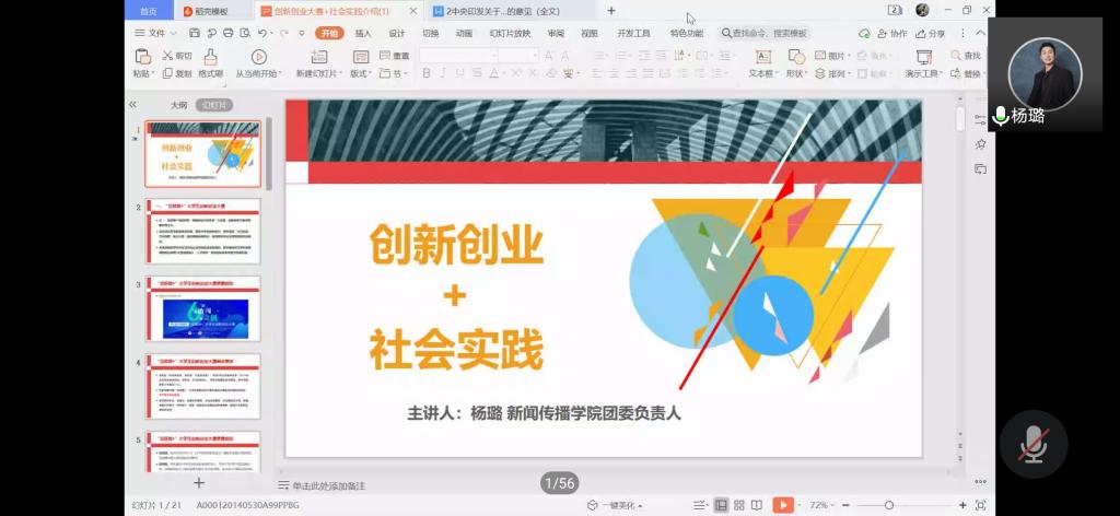 在会议开始,学院团委负责人杨璐对全体学生进行了培训,主题是社会实践调查和创新创业活动的基础知识普及。杨璐首先介绍了双创比赛的内容,讲解了“‘互联网+’大学生创新创业大赛”“挑战杯系列竞赛”的基本要求,并重点围绕新闻传播专业的优势比赛项目“全国大学生广告艺术大赛”进行介绍。其次围绕社会实践活动,介绍了活动的必要性、组织方法和相关流程。他鼓励同学们早做规划、积极沟通、广泛参与。