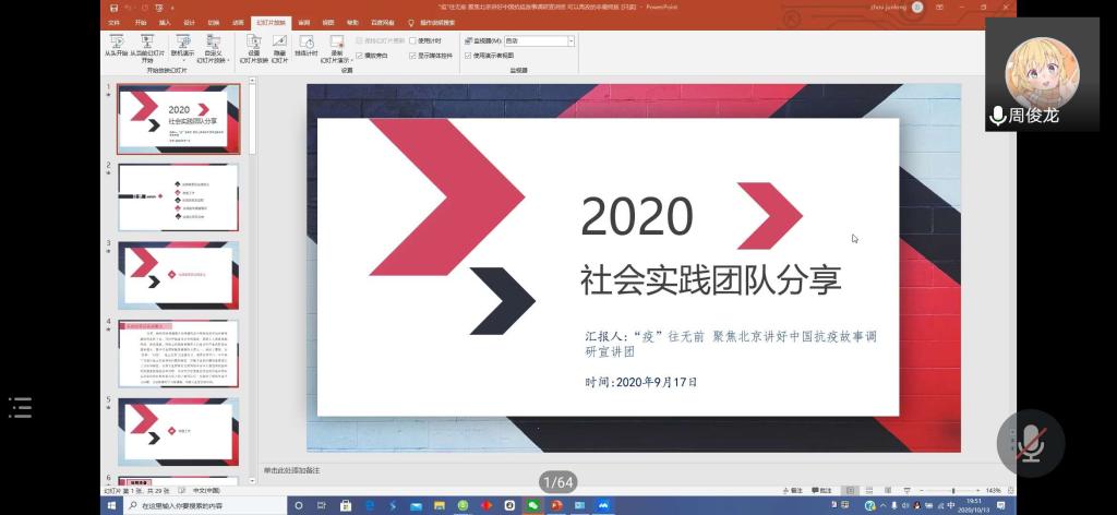 两支社会实践优秀团队率先作报告。其中,“寻访优秀校友”活动团队的分享分为五个环节,包括对实践成果做概述、介绍项目流程、分享实践经验、列举相关采访实例、阐述活动感想。主讲人介绍了团队在寻访优秀校友过程中所遇到的诸多突发情况和应对办法,多角度讲述了团队改进优化方案,不断成长的过程,展现了一支优秀团队所具备的反思能力、纠错能力、应变能力,具有较好的启示意义。另一支“‘疫’往无前”团队,讲述了疫情环境下参与线上实践活动的相关情况。内容中包括抗疫期间对中美宣传对抗情况和舆论环境的分析,举办线上讲座和宣讲会的办法,活动的心得和收获。主讲人在分享中体现了实践活动在形式上的创新,积极结合新技术的趋势,也体现出如何利用这一优势,提高活动中宣传环节的工作效率。在分享结束前,团队主讲人结合当下环境,对中国未来面对错综复杂的国际舆论环境和可能面对的问题进行了构想与展望,具有较好的思想启发作用。