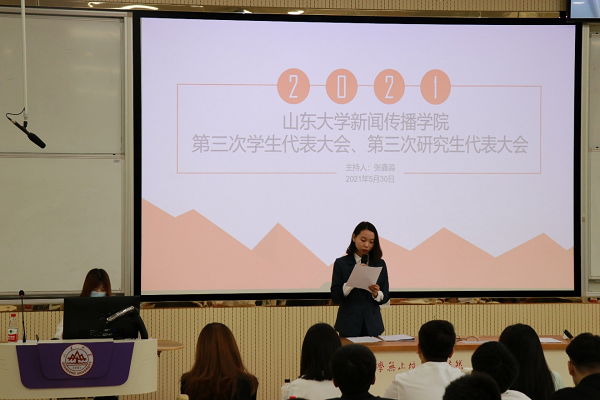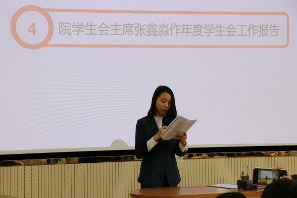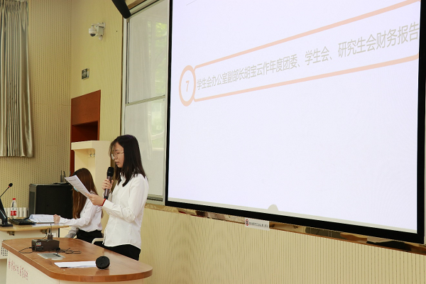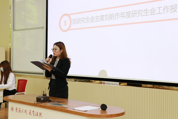 随后,新闻传播学院团委副书记王凤敏作年度团委工作报告,从学院团委组织架构“三位一体”、宣传工作“四大板块”、文体活动“四大系列”、社会服务“三大创新”、社团活动“架构+价值”等方面介绍了团委工作;院学生会主席张鑫淼作年度学生会工作报告,从思想引领、体制革新、活动创新、权益保障、宣传引领等方面汇报学生会工作,并就学生会进一步完善体系、提高效能路径进行了展望;院研究生会主席刘帆作年度研究生会工作报告,介绍了研究生会在组织改革、党史学习、科研创新、校地合作、文体活动等方面献礼建党百年、建校百廿的工作历程,针对既有问题提出健全评价体系、创新工作机制等工作规划;院权益委员会主席宋书扉作权益委员会工作报告,总结了权益委员会在活动组织、细则评定、奖助学金评定等方面的工作,并将在新学年继续促进师生沟通、完善权益保障体系;院学生会办公室副部长胡宝云作年度团委、学生会、研究生会财务报告,公开“一委两会”收支情况并提请各位代表审议。