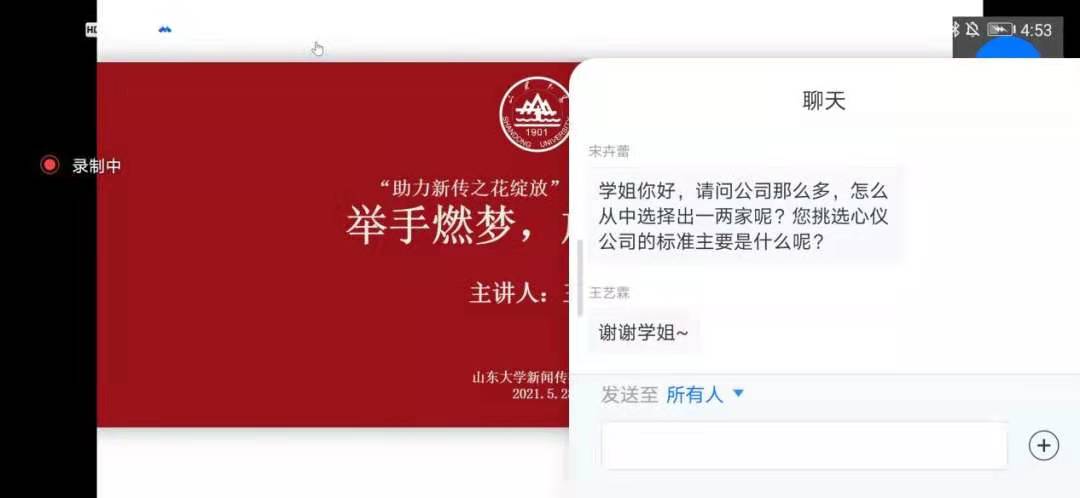 问题解答结束后,自由问答环节,针对同学们提出的“如何选择就业岗位”的问题王风以自身所在公司为例进行了具体的回答,并提醒大家:物质奖励在大多数情况下并非实习应该最关注的部分。获得宝贵的实习经验,锻炼自己的专业技能,了解一个行业的运行逻辑都是实习经历可以回报给我们的宝贵财富。