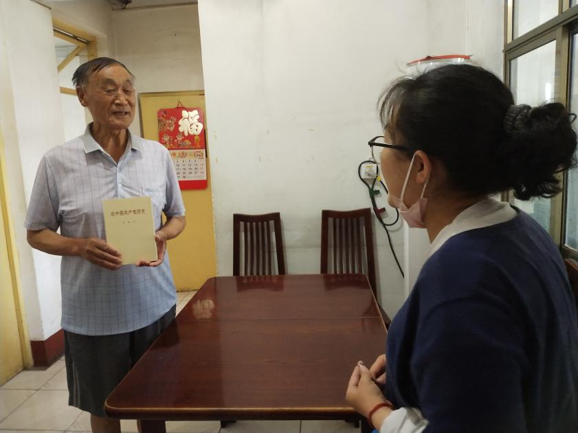 (我们跟随社区工作人员走访老党员,宣传党史)