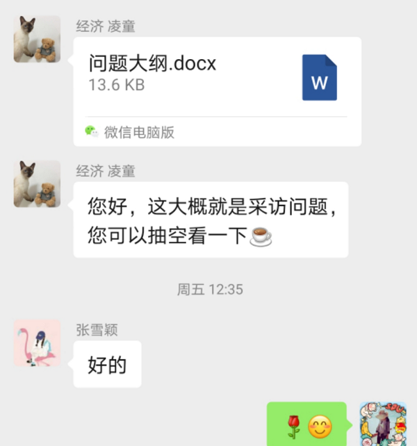 新闻传播学院寻访首都筑梦山大人队提前拟定了针对张雪颖校友的采访问题大纲,并发给校友知悉以便简单做准备,因此采访进行的十分顺利。采访过程中,团队成员凌童与校友交流愉快、顺畅,气氛十分融洽。孙思琪回答了基本介绍、个人成长历程、求学经历、职业发展、寄语五个方面的具体问题,观点清晰,感悟深刻,引人深思。